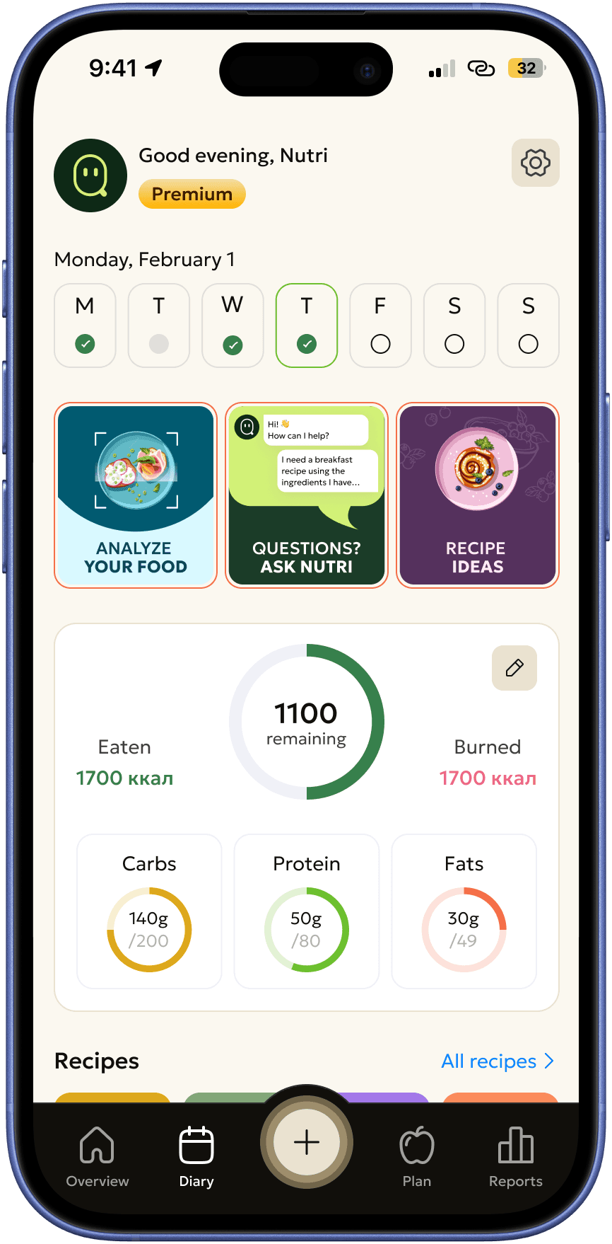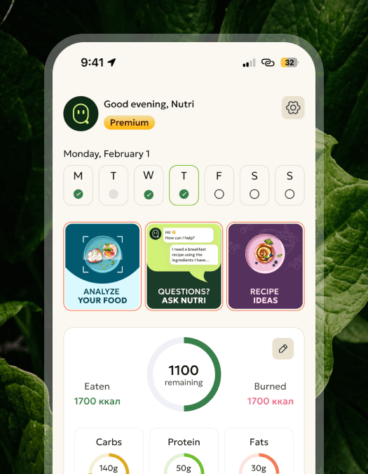 A nutrition app that goes beyond calorie tracking, using AI to build and continuously adjust personalized meal plans across a library of 3,000+ meals, based on each user's goals, habits, and daily activity.